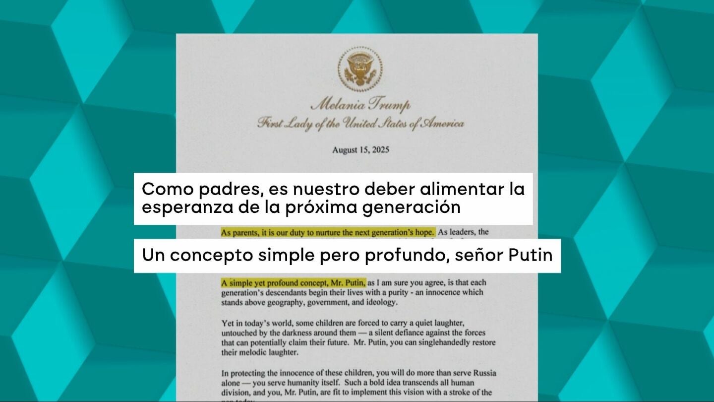 Melania Trump, primera dama de Estados Unidos, entregó una carta a Vladímir Putin durante una reunión en Alaska con Donald Trump. En la misiva, Melania apeló a los sentimientos de Putin para proteger a los niños de Ucrania, destacando la importancia de preservar la inocencia infantil más allá de fronteras e ideologías. Mientras tanto, Olga Zelenska, esposa del presidente ucraniano Volodímir Zelenski, exige el regreso de miles de niños secuestrados por Rusia. Zelenska denuncia que los menores regresan mentalmente afectados y critica que sean tratados como mercancía. Existen bases de datos para elegir niños ucranianos, con al menos 19.500 menores desaparecidos, según autoridades ucranianas.