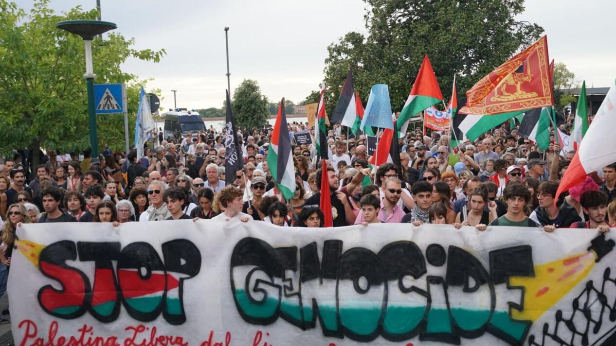 El lugar indicado para este encuentro fue la plaza de Santa María Elisabetta, el principal punto de desembarco de la isla del Lido en la que tiene lugar la Mostra. Rápidamente comenzó a llenarse de banderas palestinas y de pancartas contra el "genocidio" en Gaza.