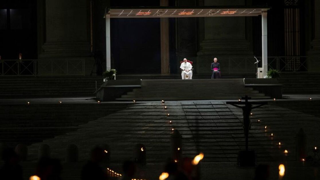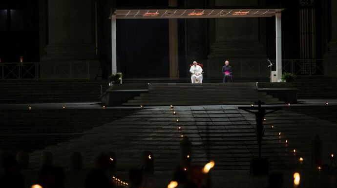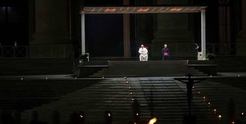 El papa ha presidido un insólito Via Crucis marcado por la pandemia de coronavirus desde un palco en medio de la Plaza de San Pedro completamente vacía y sólo iluminada por la luz de las velas.