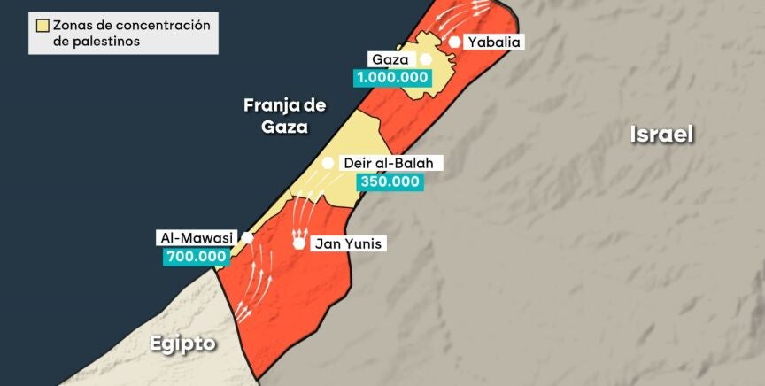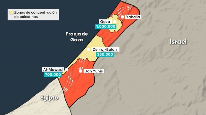 El Ejército israelí pretende crear tres zonas de concentración que alojarán a 350.000 personas en Deir al-Balah, 700.000 en Al Mawasi y un millón en ciudad de Gaza. Tel Aviv ha definido estas zonas como "seguras".