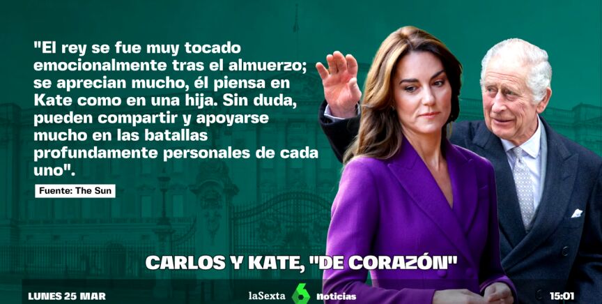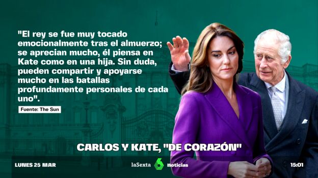 Grabarse, confirmado, se grabó el miércoles. El día antes, Kate recibió en Palacio a su suegro para una emotiva comida, tras la que el rey Carlos III "se fue muy tocado emocionalmente", según fuentes palaciegas al diario 'The Sun', que añaden: "Se aprecian mucho, él piensa en Kate como en una hija. Sin duda, pueden compartir y apoyarse mucho en las batallas profundamente personales de cada uno".