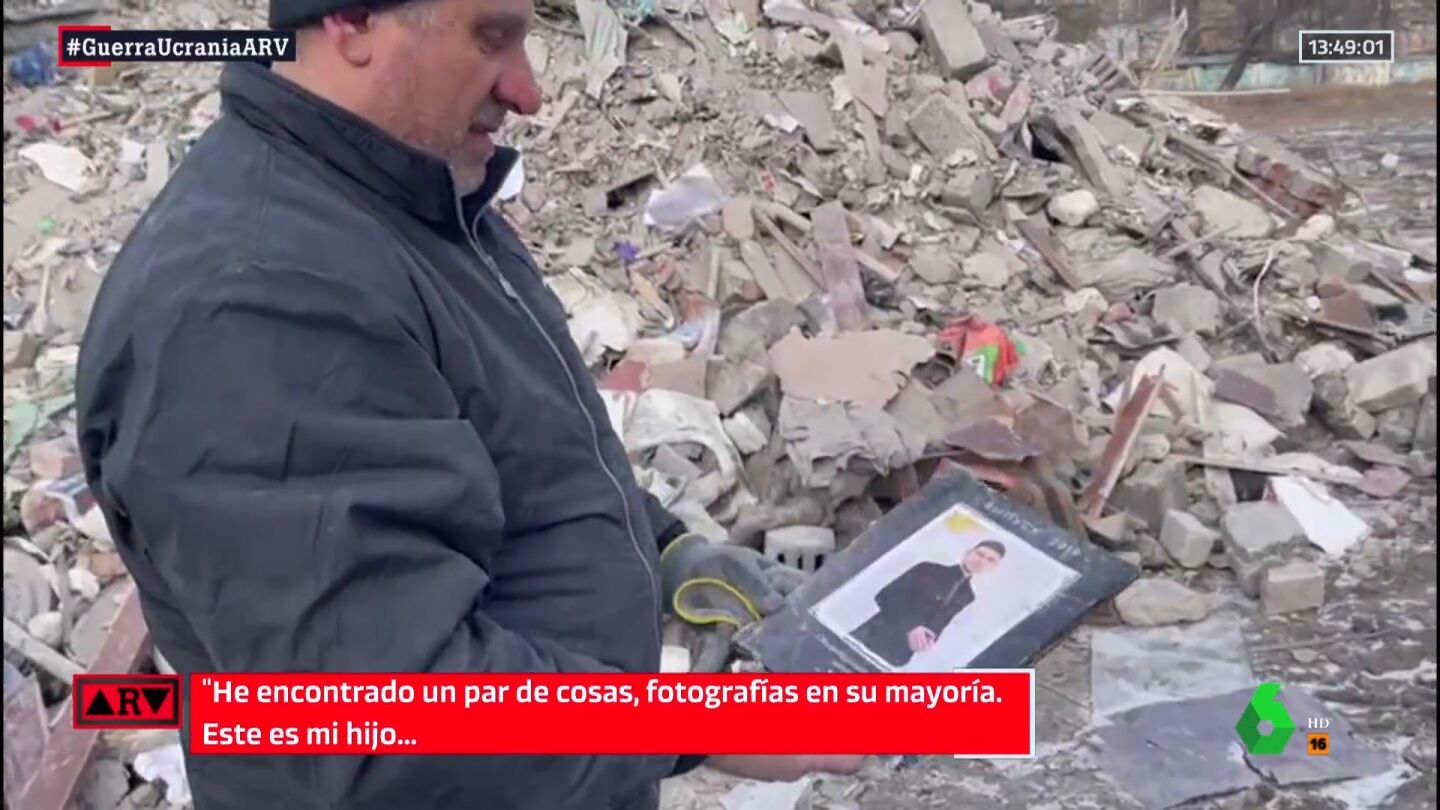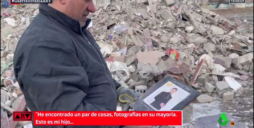 "Ayer no encontré nada, y hoy he podido ver el abrigo de mi mujer". Desolado, Maksim sigue buscando recuerdos y consigue encontrar un álbum de graduación con una foto de su hijo cuando acabó el instituto, que nos muestra en el vídeo que encabeza estas líneas.