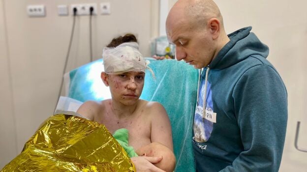 En la imagen superior observamos a Olga herida, llena de rasguños y con gesto serio. Pese a su apariencia, ella asegura encontrarse bien porque consiguió proteger a su hija tras el ataque ruso. Esa es la causa de sus lesiones, utilizó su cuerpo como protección entre su bebé y los cascotes y cristales que iban hacia ellas.