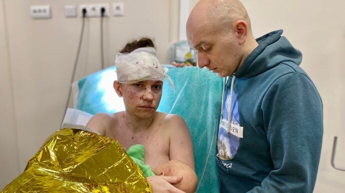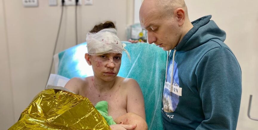 Esta fotografía, del 17 de marzo, la compartió el Hospital de Niños Ohmatdit en Kiev, tras ayudar a los tres miembros de esta familia que acaban de sufrir las consecuencias de uno de los bombardeos del ejército de Putin a Kiev.