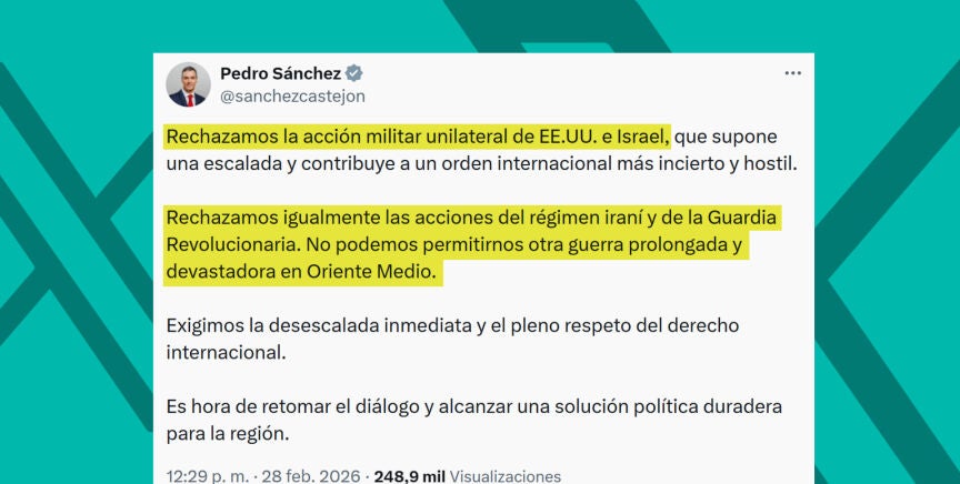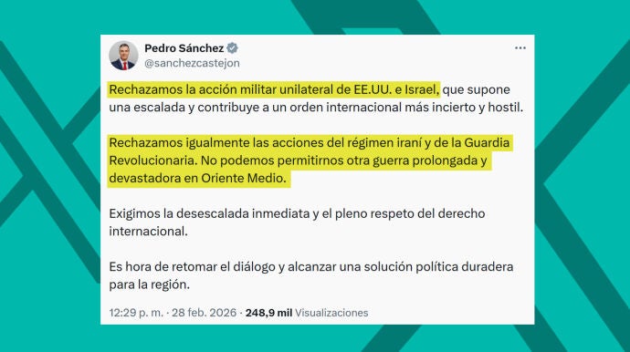 En un mensaje difundido en redes sociales, el presidente del Gobierno ha comenzado mostrando su rechazo a "la acción militar unilateral" de EEUU e Israel, lo que "supone una escalada y contribuye a un orden internacional más incierto y hostil". Ahora bien, también ha mostrado su rechazo a "las acciones del régimen iraní y de la Guardia Revolucionaria".