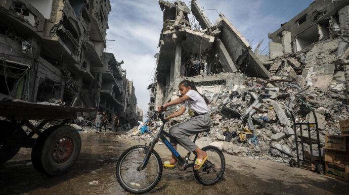 Una funesta efeméride en la que el Ejército israelí ha anunciado la retirada parcial de sus tropas terrestres, tras meses de sangrientos bombardeos y combates que dejan también cerca de 76.000 heridos, según los últimos balances de las autoridades gazatíes, controladas por el movimiento islamista. Una destrucción implacable que está reduciendo la Franja a escombros y sembrando el hambre entre su población.