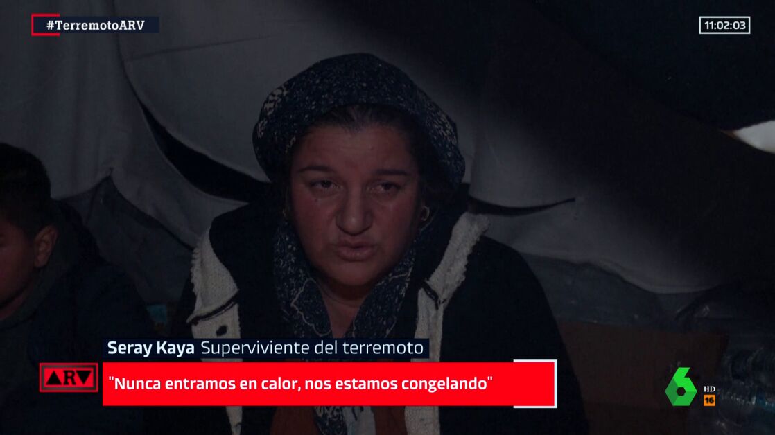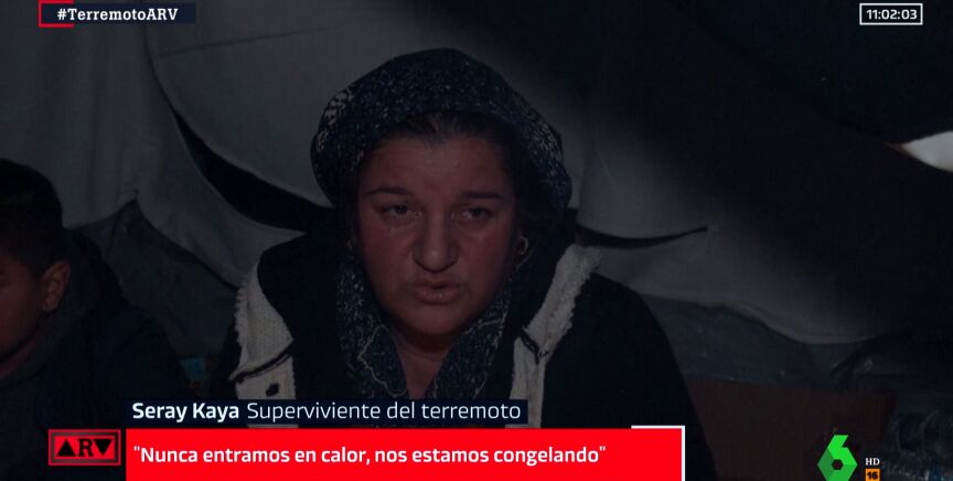 Seray Kaya, superviviente del terremoto, explica que "ni siquiera hemos tenido una triste bebida caliente en dos días. Dormimos en la calle o con suerte en el coche. Hemos encendido una hoguera frente a la puerta de nuestros vecinos. Hoy nos hemos venido a la tienda de campaña pero nos estamos congelando porque hay agua debajo de ella. Nunca entramos en calor, nos estamos congelando".