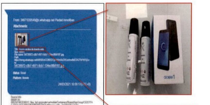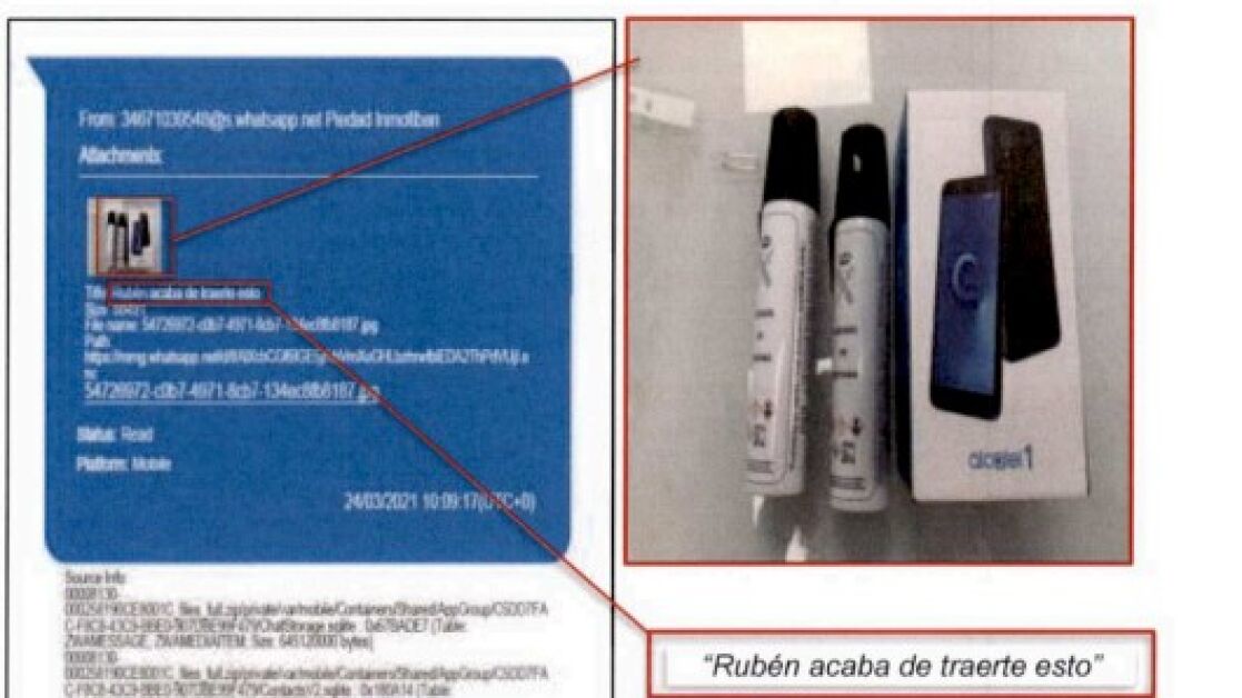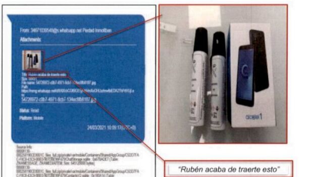 Cuestión que también hace sospechar a los investigadores tras encontrar una "conversación de WhatsApp entre Aldama y [su secretaria] Piedad [Losada], en el que esta última le envía una imagen de una caja de un teléfono móvil, de la marca Alcatel modelo 1 con dos aerosoles de defensa personal de dotación de la Guardia Civil, indicando que se lo había traído Rubén [Villalba]".