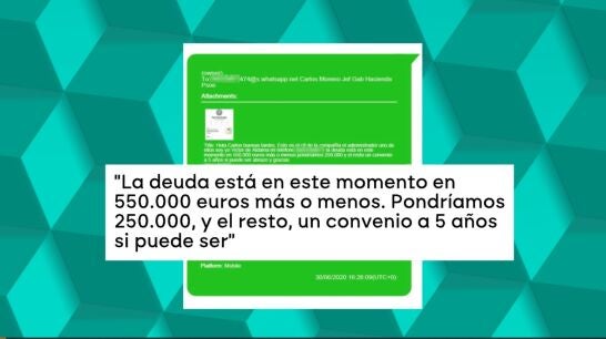 Un mensaje que figura en el escrito que la defensa de Aldama ha presentado para oponerse a la petición del PSOE para que vuelva a prisión. En él, el empresario se dirige a Moreno por su nombre de pila -"Hola Carlos buenas tardes", comienza el texto-, aporta el CIF de la compañía en cuestión y le indica que él mismo es uno de sus administradores, junto a su número de teléfono. Asimismo, propone pagar ahora una parte de la deuda y aplazar el resto y se despide con un "abrazo y gracias".