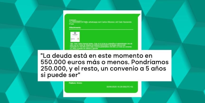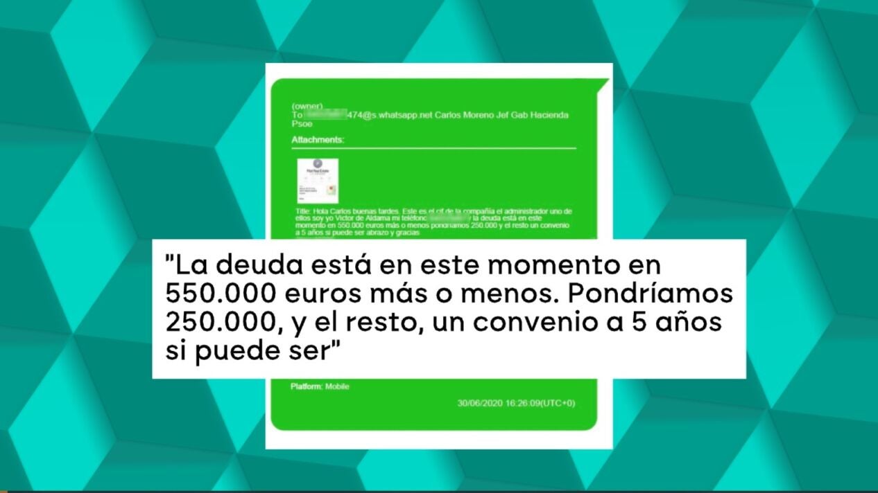 "La deuda está en este momento en 550.000 euros más o menos, pondríamos 250.000 y el resto un convenio a 5 años si puede ser". Es el mensaje que Víctor de Aldama habría enviado a Carlos Moreno, jefe de gabinete de María Jesús Montero, para pedirle el aplazamiento de una deuda de su empresa Pilot Real State.