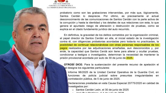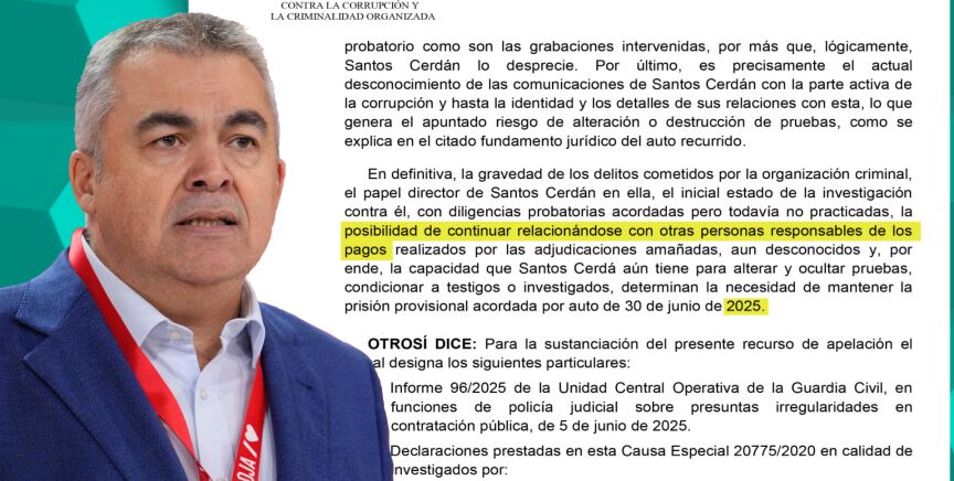 En su escrito, Luzón se opone frontalmente a la puesta en libertad del exdirigente socialista alegando que existe riesgo de destrucción o alteración de pruebas. Además, sostiene que Cerdán podría "continuar relacionándose con personas aún desconocidas" relacionadas con la trama Koldo e implicadas en el supuesto amaño de contratos, así como "condicionar a testigos o investigados" en caso de abandonar la prisión de Soto del Real.