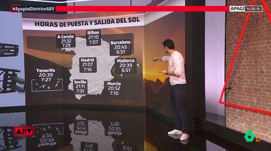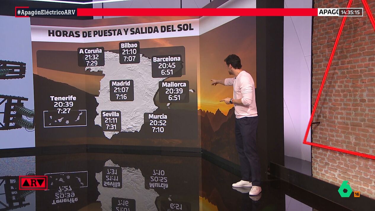 Francisco Cacho, presentador de laSexta Meteo, ha entrado en directo en Al Rojo Vivo para responder a una de las preguntas que más preocupan hoy a los españoles: ¿Cuándo se pone el sol? ¿Hasta qué hora tendremos luz del día? "Si la situación sigue así, será muy importante esta información", avisa el presentador.