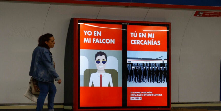 Estos carteles aparecieron en la estación de Sol, y cargan contra la gestión de los trenes de Cercanías por parte del Gobierno de España. Aunque es legal, el PSOE ha anunciado que recurrirá ante la Junta Electoral Central.