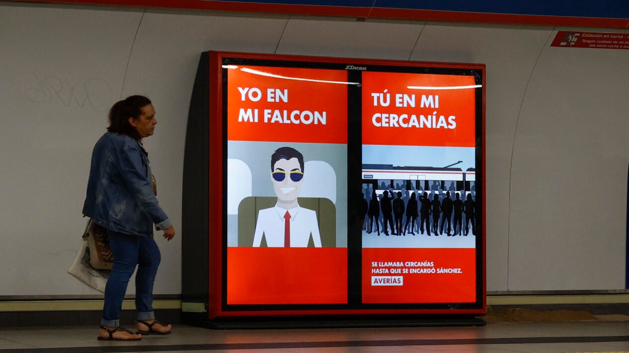 Aparecen carteles contra Pedro Sánchez en el Metro de Madrid: "Mi Falcon tiene más frecuencias que tu Cercanías"