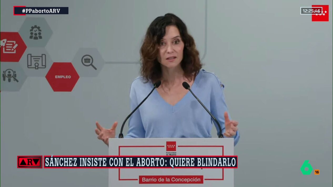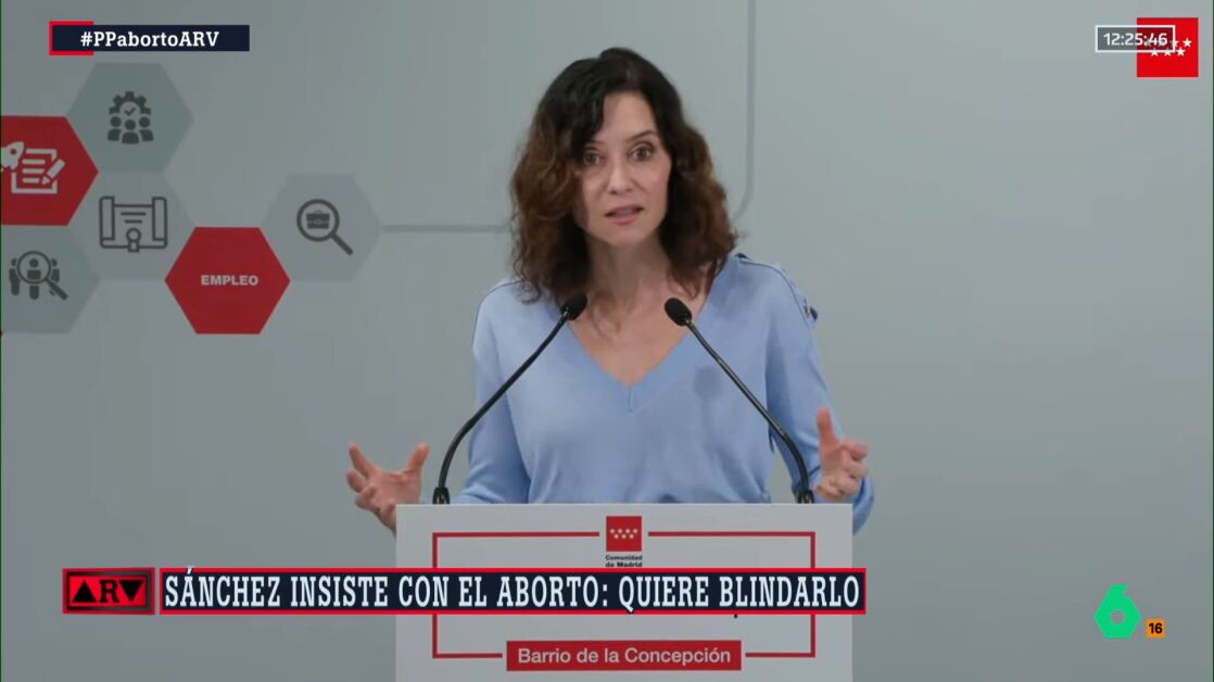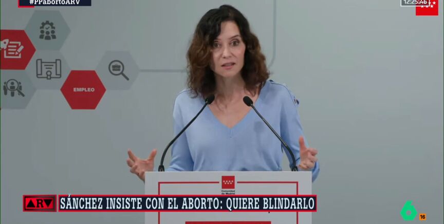 Isabel Díaz Ayuso ha criticado a Pedro Sánchez por lo que considera "amenazas" del presidente del Gobierno, quien ha instado a la Comunidad de Madrid a crear un registro de médicos objetores para garantizar el derecho al aborto. Ayuso ha acusado a Sánchez de dirigirse a ella con un "tono machito" y ha aludido a su experiencia personal con abortos espontáneos. Ha cuestionado la autoridad de Sánchez para hablar en nombre de todas las mujeres y le ha comparado con el franquismo.