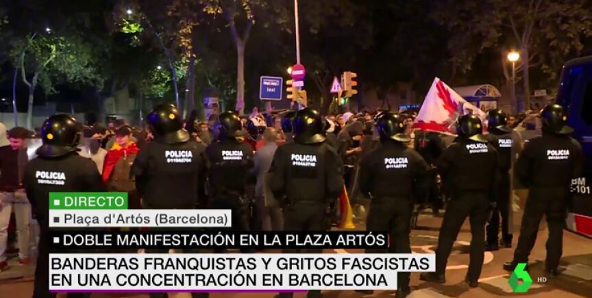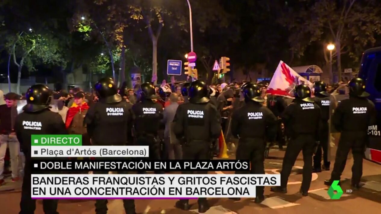 Tensión en la plaza de Artós, en Barcelona, donde se manifiesta un grupo de gente con banderas franquistas y, muy cerca, otro grupo de los autodenominados antifascistas. Hay mucha presencia policial.