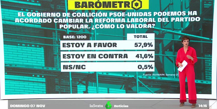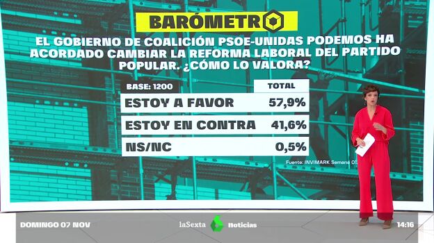 Tras el acuerdo entre el Gobierno de coalición para cambiar la reforma laboral del Partido Popular, el barómetro de laSexta comprueba su aceptación. La mayoría del 58% de los encuestados está a favor del cambio, mientras que un 41,6% que está en contra.