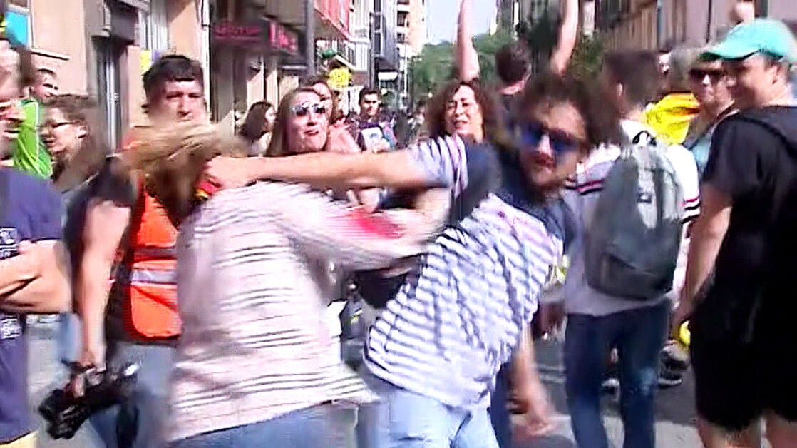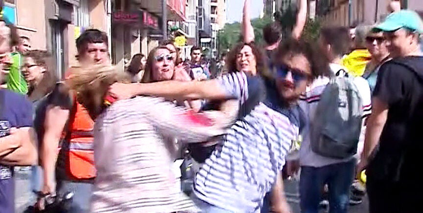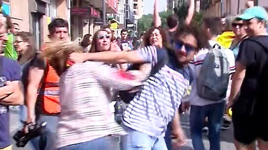 La mujer responde gritando: "Estáis pisando suelo español". Y es en ese momento cuando aparece un joven que trata de arrebatarle la bandera de las manos. Sin embargo, la mujer se resiste y la respuesta del manifestante es golpearle un tremendo codazo que acaba con la mujer en el suelo. El gesto es criticado por el resto de manifestantes.