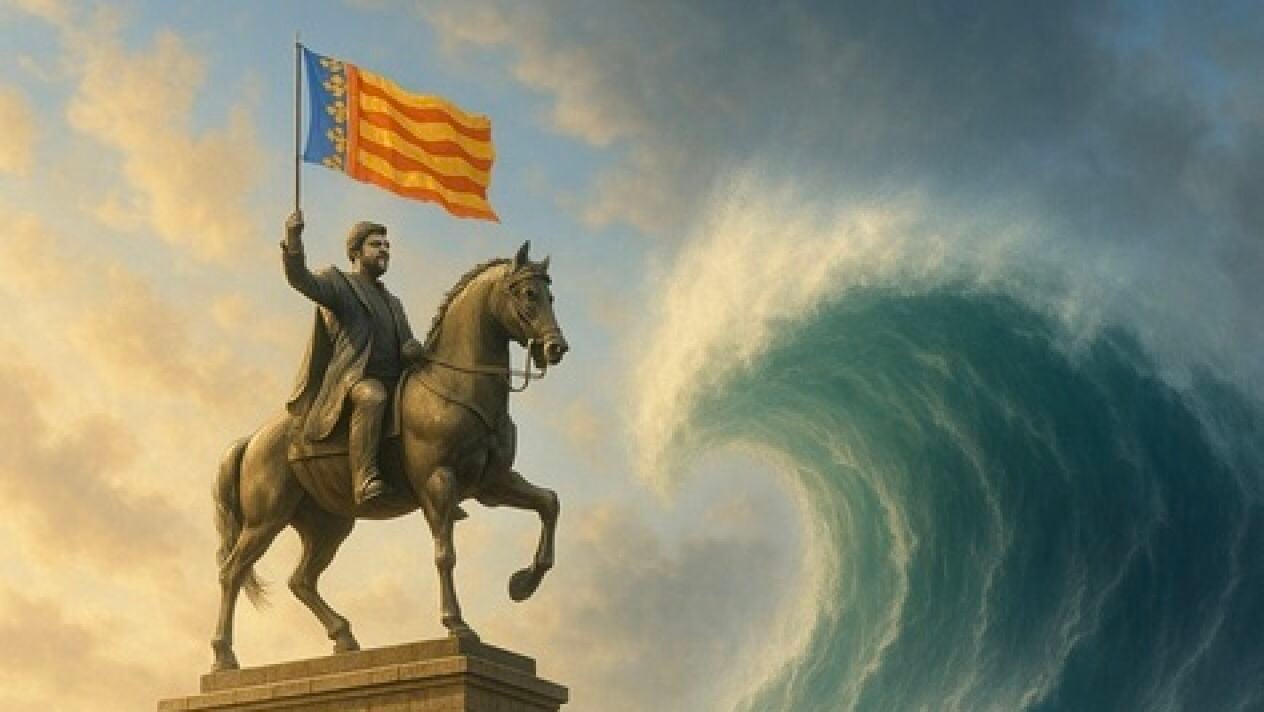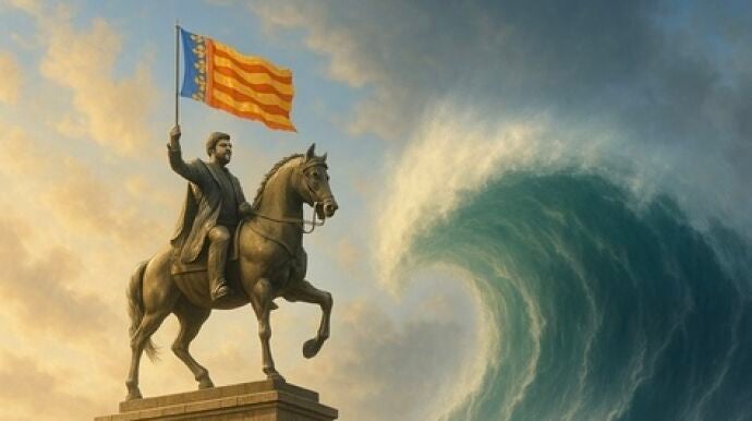 El contexto: En la propuesta, la figura del president se presenta a caballo, portando una Senyera y se explica con sorna que estará sobre "un muro de contención robusto y estético en una zona de alto riesgo de riadas, con el objetivo de proteger a la población, las infraestructuras y los cultivos cercanos".