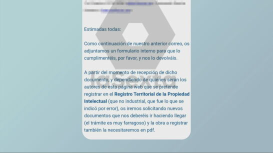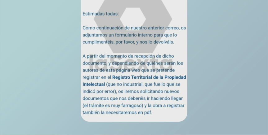 Y después le añade, que "a partir del momento de la recepción de dicho documento, y dependiendo de quiénes serán los autores de esta página web que se pretende registrar en el Registro Territorial de la Propiedad Intelectual (que no industrial, que fue lo que se indicó por error), os iremos solicitando nuevos documentos que nos deberéis ir haciendo llegar".