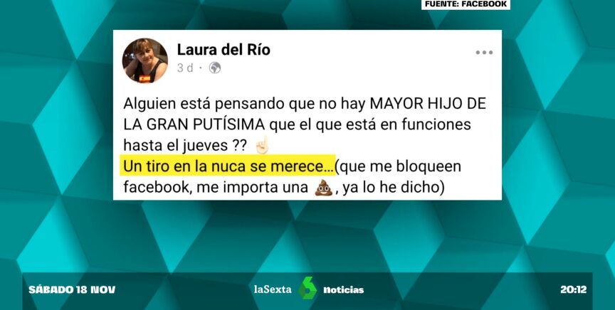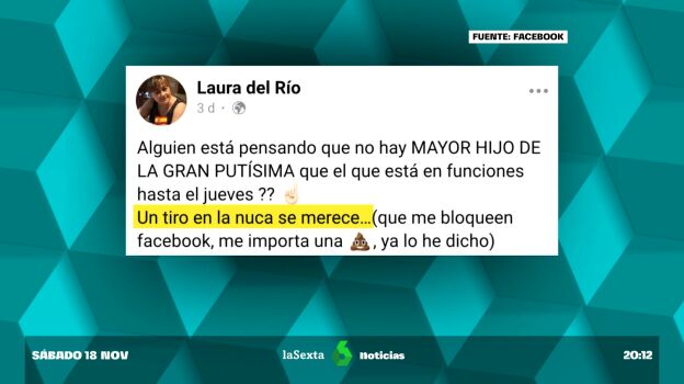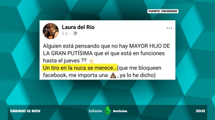La concejala del Partido Popular de Gomezserracín (Segovia) y exalcaldesa del mismo, Laura del Río, ha asegurado que Pedro Sánchez se merece un "tiro en la nuca" y ha calificado al presidente del Gobierno en sus redes sociales como el "mayor hijo de la gran putísima".