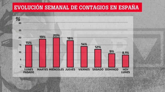 Lo cierto es que las 812 víctimas registradas en las últimas horas suponen un aumento del 12,4% respecto a la víspera, un porcentaje menor que el domingo, cuando ese incremento fue del 14% respecto al sábado. Lo mismo ocurre con los contagios. En las últimas horas hay 6.398 casos más, lo que refleja un aumento del 8,11% respecto al domingo; el día anterior ese incremento fue del 9%.