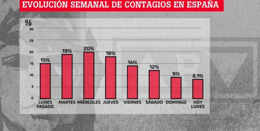 No obstante, Corbella apunta que mañana se verá un repunte que no debería asustar, "pues podría deberse a un retraso en las notificiaciones del fin de semana". Habrá que esperar para ver si los datos confirman sus palabras y se observa como los casos siguen disminuyendo en los próximos días.