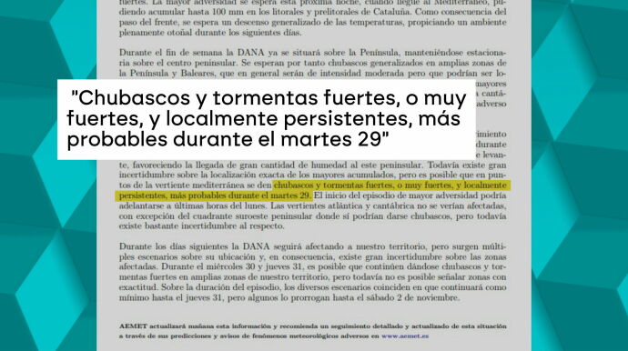 El 25 de octubre, viernes, la Agencia emitía una nota informativa hablando de "chubascos y tormentas fuertes, o muy fuertes, y localmente persistentes", y ya ponía posible la lupa en un posible 'Día D', apuntando que serían "más probables durante el martes 29". Un día después, el sábado 26, la AEMET señalaba que se esperaban "chubascos muy fuertes sin poder descartar" que alcanzasen "localmente intensidad torrencial".