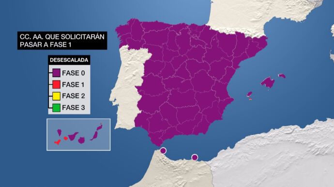 El próximo lunes, nuevos territorios entrarán en la fase 1 de la desescalada, uniéndose así a las cuatro islas que entraron directamente en esta fase el pasado día 4 de mayo, cuyos habitantes ya pueden acudir a terrazas o reunirse con familiares y amigos en grupos de hasta 10 personas. La decisión del Ejecutivo se conocerá el próximo sábado.