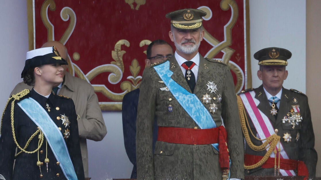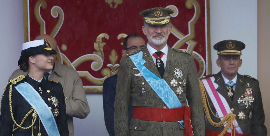La cámara del fotógrafo de Europa Press Alejandro Martínez Vélez captaba este momento íntimo entre el rey Felipe VI y el presidente del Gobierno, Pedro Sánchez. Con un manto de lluvia delante, con la princesa Leonor a la derecha ejerciendo saludando a las autoridades y escoltados por integrantes de las Fuerzas y Cuerpos de Seguridad del Estado, engalanados para la ocasión, presidente y monarca compartían unas palabras minutos antes de comenzar el desfile.