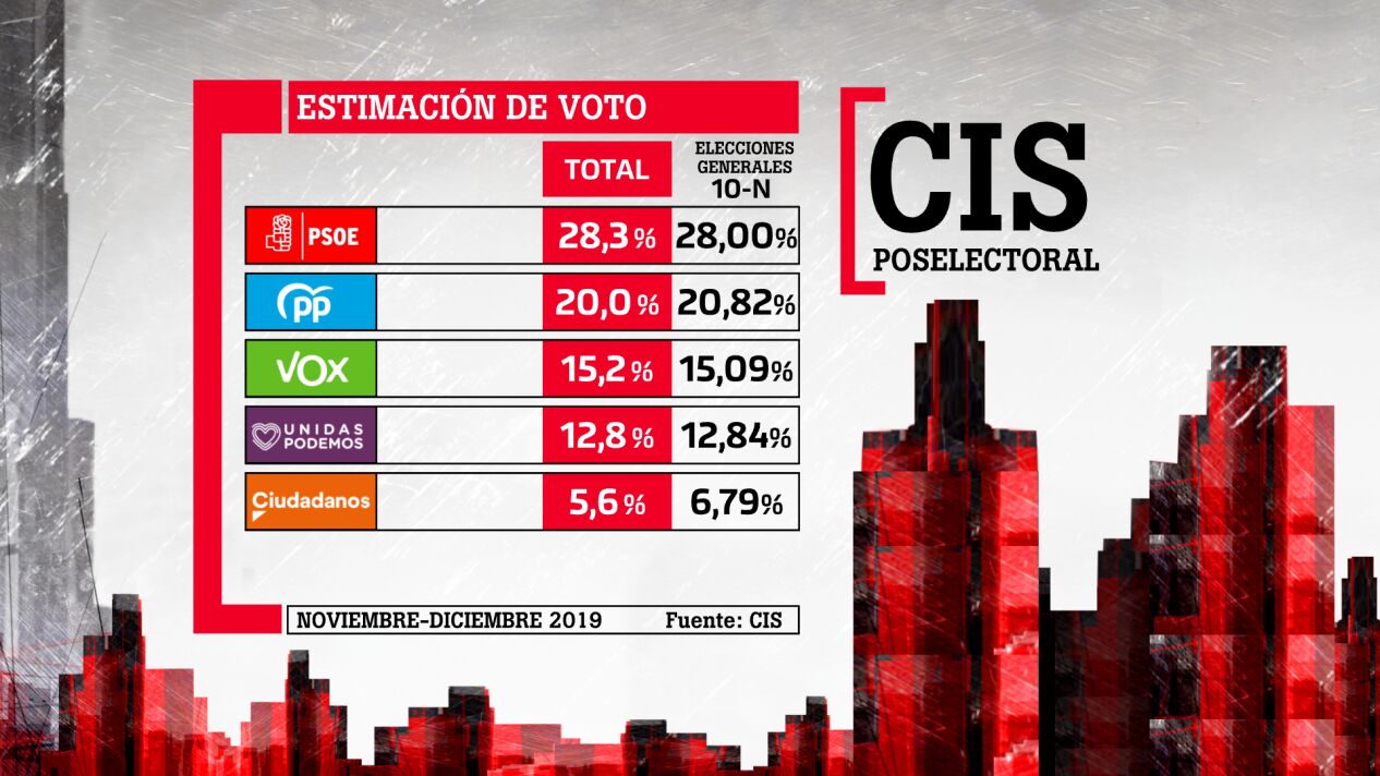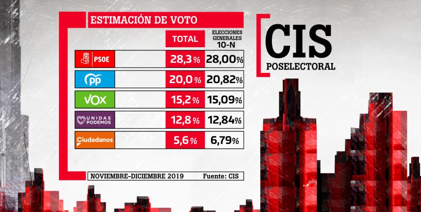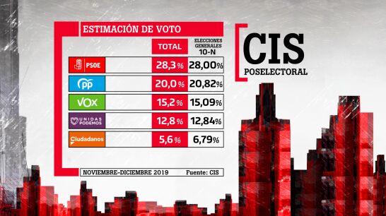El 10 de noviembre, el PSOE obtuvo un 28% de voto; el PP, 20,82%; Vox, 15,09%; Unidas Podemos, 12,84% y Ciudadanos, 6,79%. El PSOE sube tres décimas en este CIS; es el único que sube junto a Vox. El resto baja ligeramente aunque esa caída es mayor en la formación naranja.