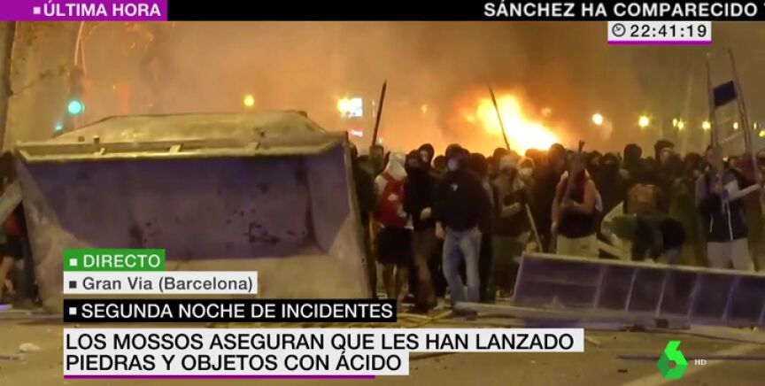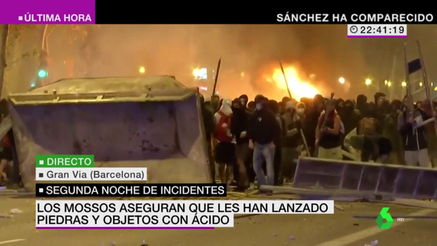 Los Mossos d'Esquadra han asegurado que los manifestantes han llegado a lanzar piedras y objetos con ácido. Incluso han ardido vehículos y todo tipo de material mobiliario en forma de barricada.