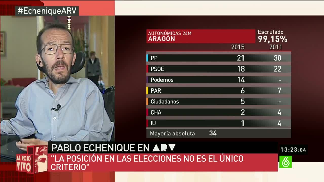 El candidato de Podemos al Gobierno de Aragón, Pablo Echenique, ha explicado en 'Al Rojo Vivo', antes de su primera reunión con el candidato socialista, Javier Lambán, que "la posición en las elecciones no es el único criterio" a la hora de decidir quién gobierna en la Comunidad. "Tengo la obligación de explorar todas las posibilidades", asegura Echenique, quien señala que "es difícil que sin un Gobierno de Podemos pueda haber un cambio real". "Nosotros vamos a hablar con todo el mundo", ha prometido.