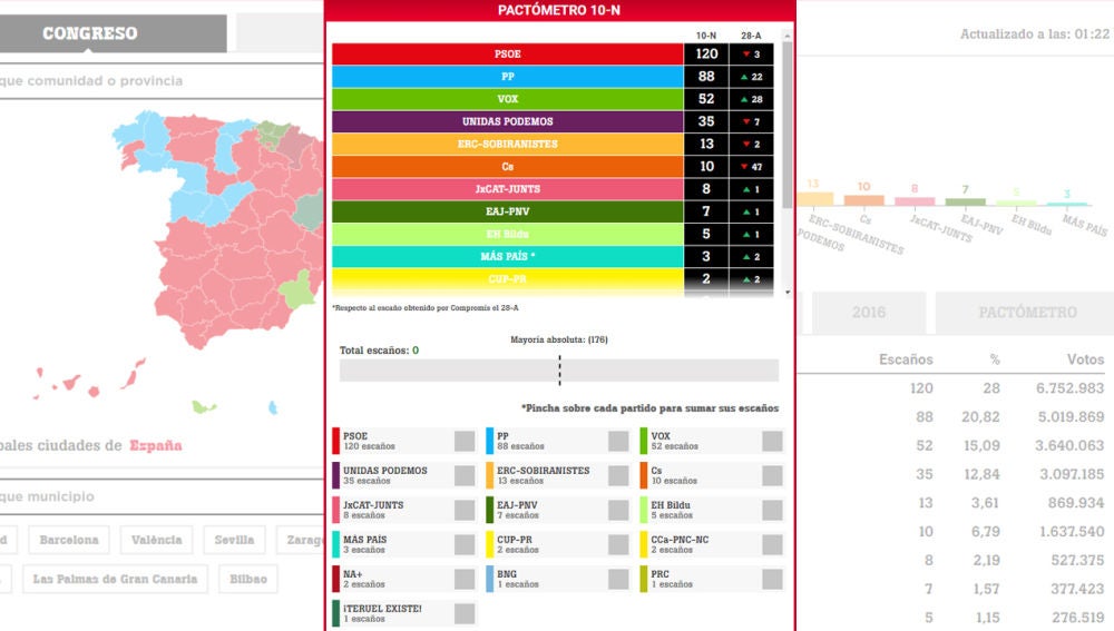Ya conocemos los datos de las elecciones generales del 10-N; es el momento de activar el pactómetro de laSexta para calcular qué coaliciones podrían sumar los 176 escaños que garantizan la mayoría absoluta en el Congreso.