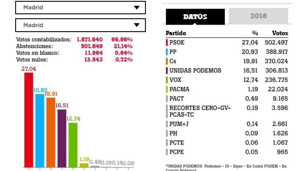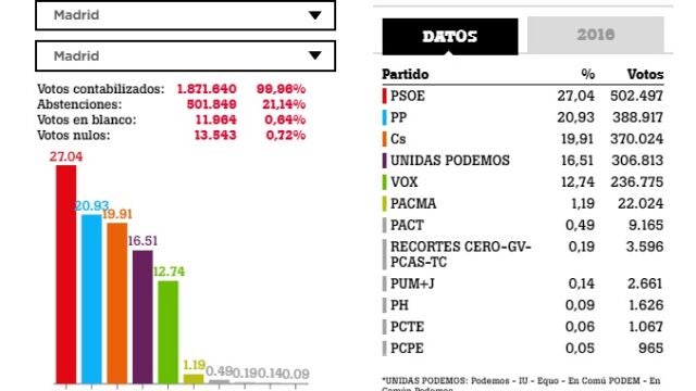 El Partido Socialista se impone al Partido Popular con 461.614 votos en la ciudad de Madrid. Le sigue, eso sí, el PP de Pablo Casado con 346.319 votos. Tras los dos históricos partidos, Ciudadanos alcanza los 331.355 votos, Unidas Podemos con 281.646 y Vox que alcanza los 214.606 votos.