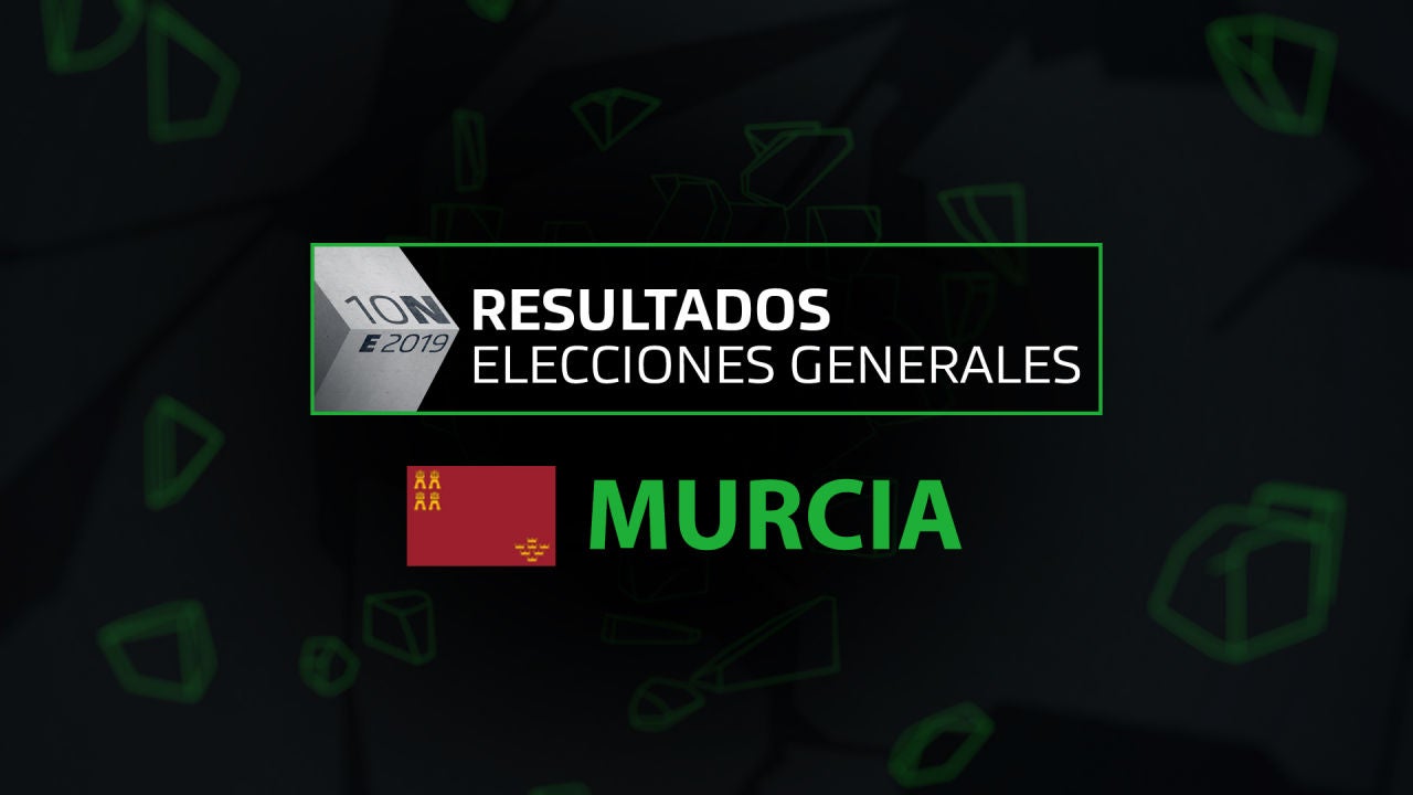 Vox se ha convertido en primera fuerza política en la Región de Murcia con el 27,99% de los votos, aunque ha empatado a escaños con el PP (3) y el PSOE (3). Conoce al detalle los resultados de las elecciones generales del 10 de noviembre de 2019 en Murcia. Número de votos, participación, porcentajes de voto, diputados y senadores al Congreso y Senado. Todos los datos electorales de los partidos políticos en Murcia.