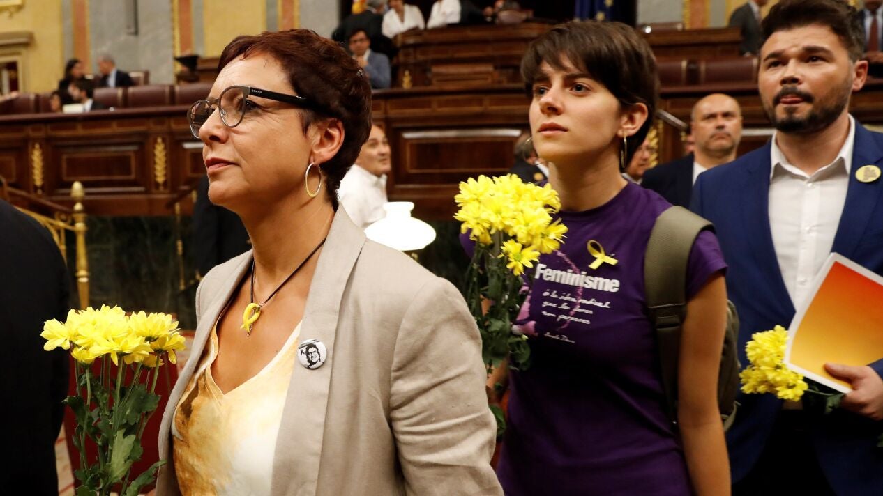 Ya en el hemiciclo, los parlamentarios de ERC han depositado las flores en la parte frontal de sus escaños o se las han colocado en las solapas. El portavoz de la formación, Gabriel Rufián, ha indicado que las llevaban "en recuerdo de que hay gente injustamente en la cárcel y en el exilio por se demócratas".