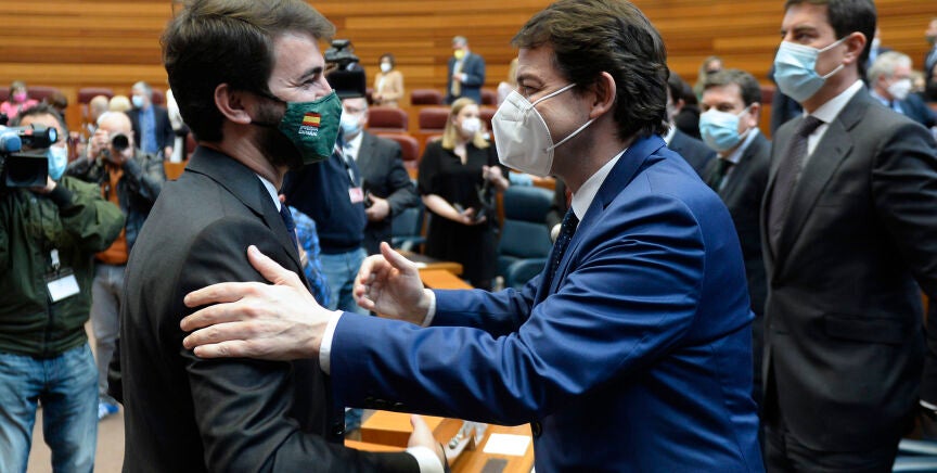 Estos son dos de los puntos plasmados en el documento de 11 ejes y 32 acciones de gobierno suscritos por Mañueco y García-Gallardo, quienes han rehuido la mayoría de las preguntas sobre el contenido del acuerdo y se han limitado a celebrarlo en sí mismo, al evitar "cualquier fantasma de repetición electoral" y servir para ofrecer a los ciudadanos un gobierno: "Hemos garantizado lo que prometí, la estabilidad política que prometí", ha afirmado el dirigente del PP.