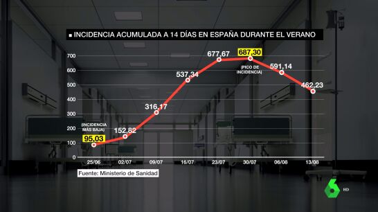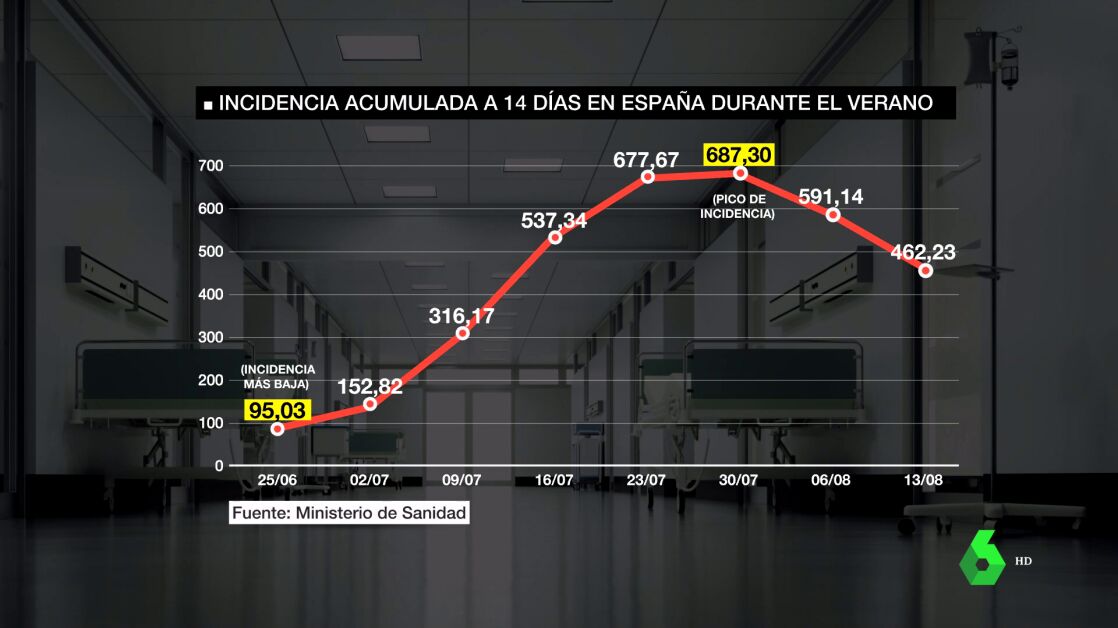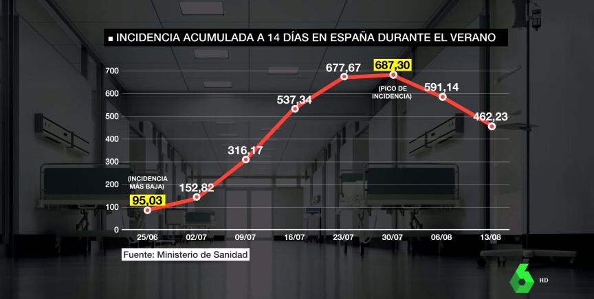 Ahora mismo, Baleares registra los peores datos, con más 600 casos. Le siguen La Rioja, Navarra y País Vasco, que superan los 500. A finales de junio, la situación era mucho más favorable en nuestro país, con la incidencia más baja de todo el verano. A finales de julio, con el primer mes de desplazamientos y vacaciones cumplido, tocamos pico de casos diagnosticados, con cerca de 700. Una cifra, que ha ido disminuyendo lentamente en las últimas dos semanas, hasta bajar de los 500.