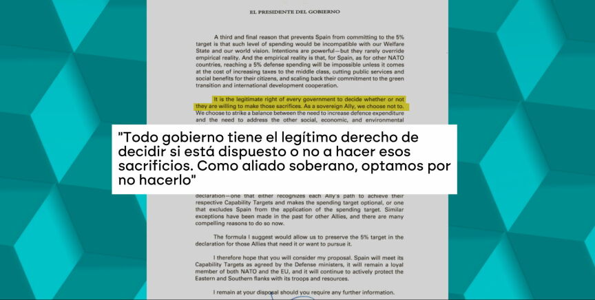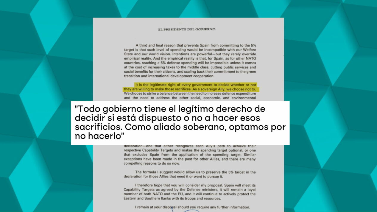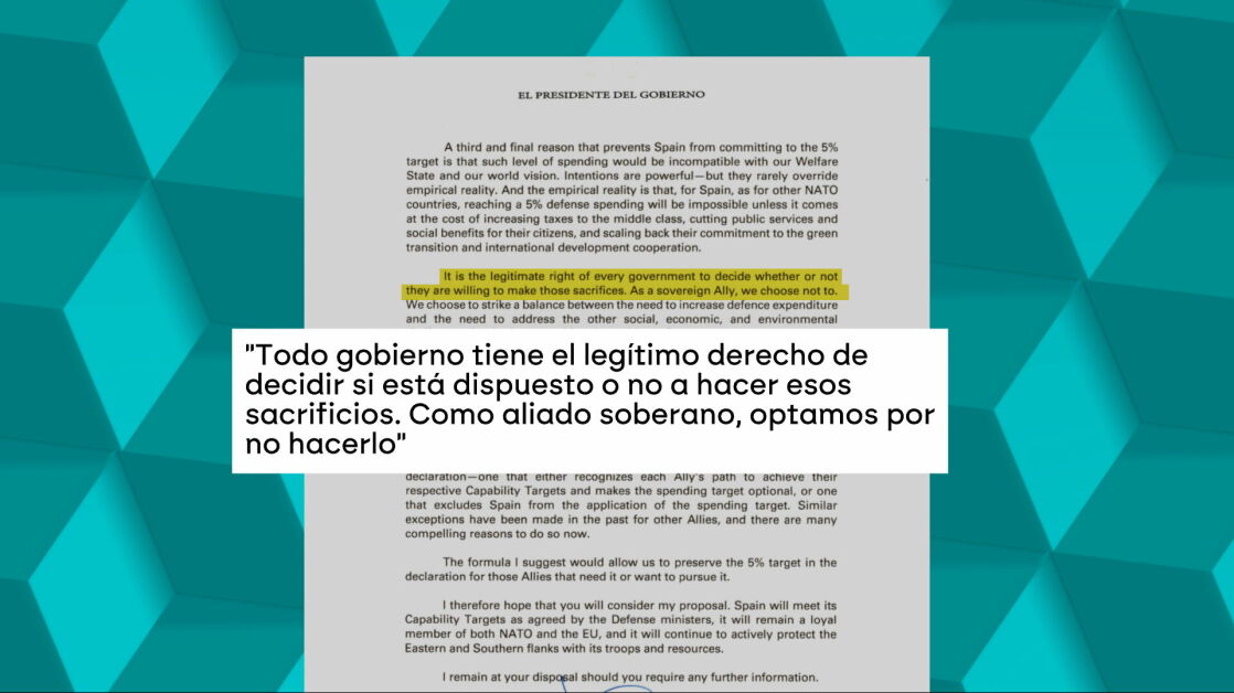 Si este jueves el presidente socialista no dudaba en mandar una carta manuscrita al secretario general de la OTAN, Mark Rutte, en la que daba detalladas razones a su 'no' a comprometerse a subir el gasto militar como miembro de la Alianza Transatlántica, este viernes los miembros del Ejecutivo, incluidos sus socios, se enrocaban en la decisión pese a los avisos desde Washington.
