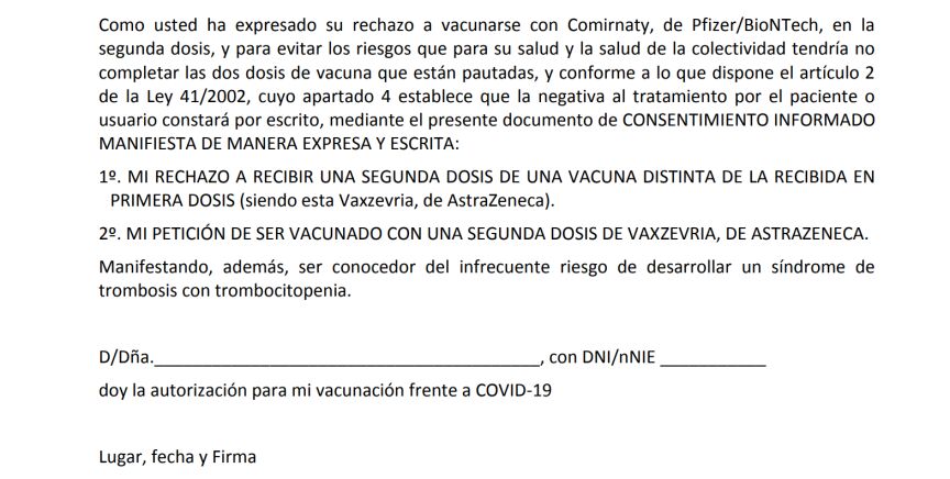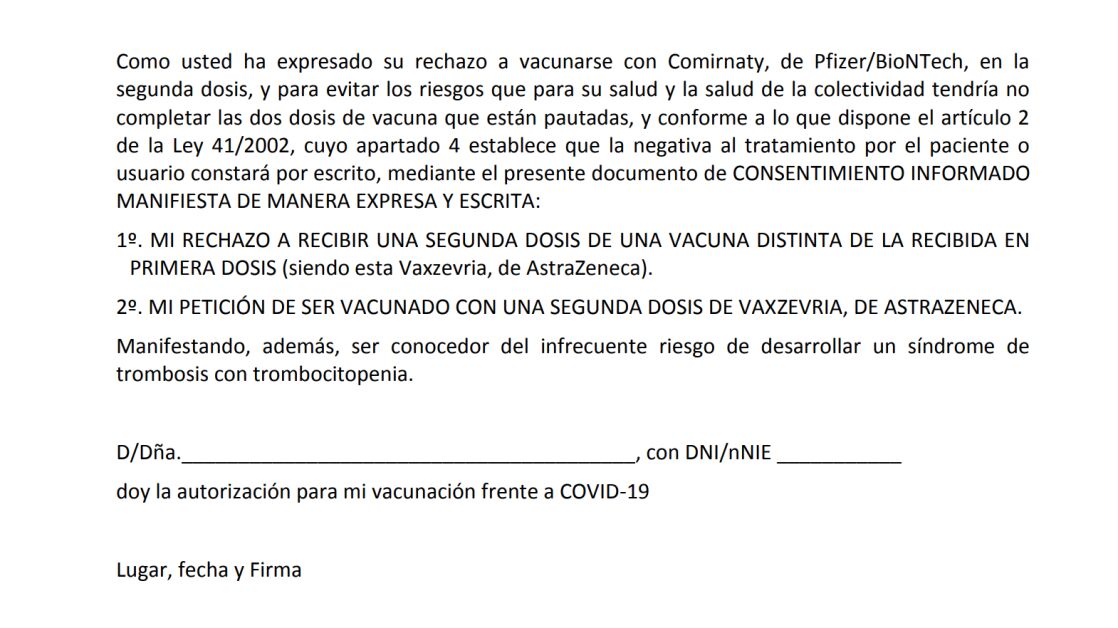 En este sentido, el documento, que puedes descargar en este artículo, remarca que la firma especifica el rechazo a recibir una segunda dosis con una vacuna distinta a AstraZeneca, "manifestando, además, ser conocedor del infrecuente riesgo de desarrollar un síndrome de trombosis con trombocitopenia", recalcan. Una posibilidad que es más que remota, pero que ha llevado a las autoridades a limitar el uso de la inyección.