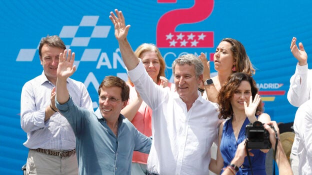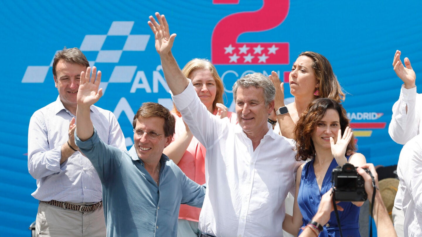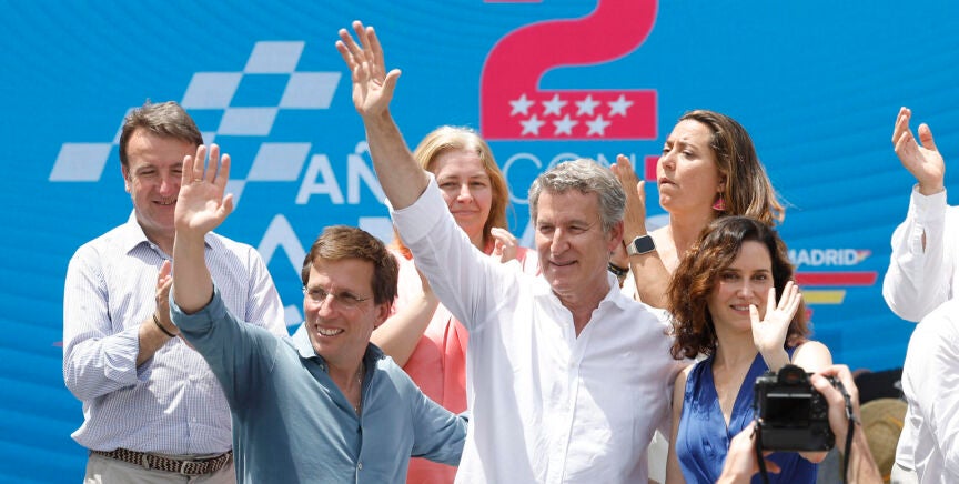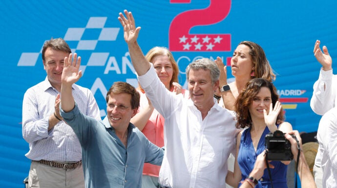 Por su parte, la presidenta de la Comunidad de Madrid, Isabel Díaz Ayuso, ha aprovechado este domingo el acto organizado por el Partido Popular para celebrar el ecuador de una legislatura en la que gobierna con mayoría absoluta para ensalzar a Feijóo, como "un presidente dispuesto a buscar unir con una paciencia infinita, que no falla a nadie". "Gracias por estar al frente con temple en estos momentos de polarización. Gracias presidente, y nos veremos el 8 de junio en la Plaza de España", ha expresado.
