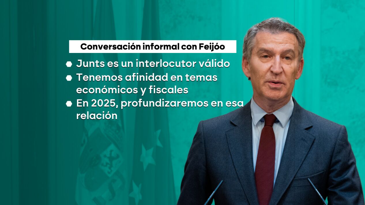 El líder del PP, Alberto Núñez Feijóo, considera que Junts es un "interlocutor válido" con el que tiene "afinidad"; al menos, en cuestiones fiscales. Y no solo eso, desde el partido popular se muestran abiertos a un acercamiento con los independentistas en 2025.