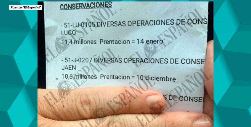 Si analizamos la foto lo único que sacamos en claro es que aparece una ciudad: Lugo, una cantidad y la palabra "prestación" más una fecha. Lo mismo sucede con la otra supuesta licitación de obra, pone Jaén, 10,6 millones y "prestación" 10 de diciembre.