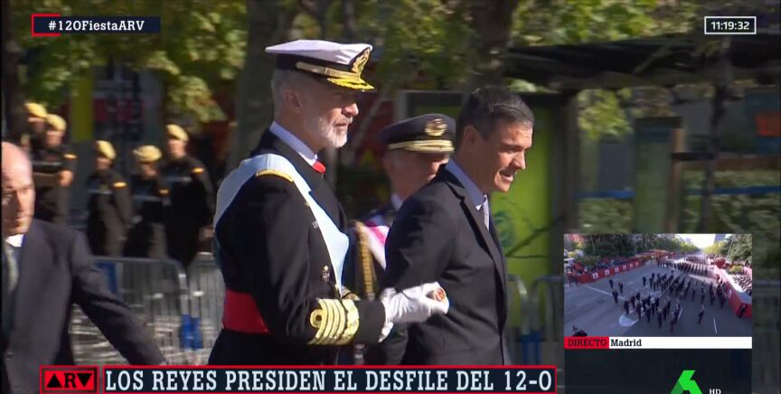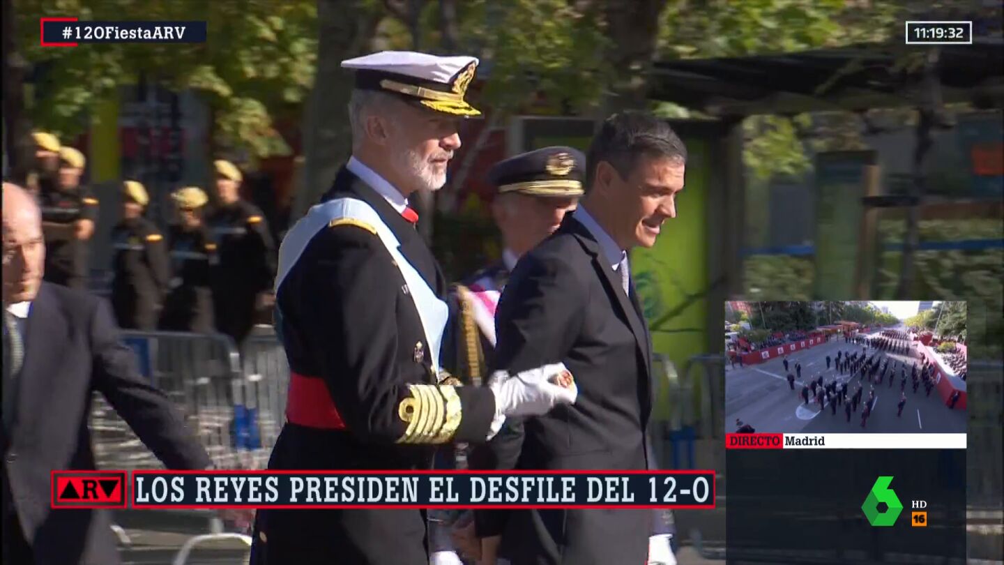 Los cientos de personas apostadas en los laterales del Paseo de la Castellana desde primeras horas de la mañana, portando banderas y banderines de España, han saludado la llegada de don Felipe y doña Letizia con vítores y aplausos. No ha sido así con Sánchez, quien a pesar de casi hacer coincidir su llegada con la de los reyes, ha sido objeto, como viene siendo habitual, de pitadas y abucheos y gritos de "Sánchez dimisión" por parte de los asistentes al desfile, que principalmente procedían de los balcones de los edificios que rodean la Plaza de Lima. Gritos e insultos que se han vuelto a repetir al final de desfile.
