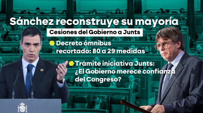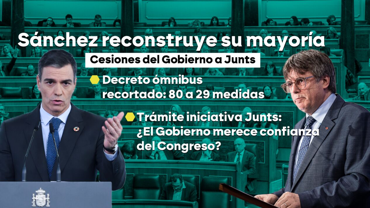 El contexto Acuerdo entre el Gobierno y Junts. Tras una mañana frenética, se ha logrado salvar buena parte del escudo social y la revalorización de las pensiones. Finalmente, Sánchez ha accedido a que se tramite una PNL con una redacción más 'soft' de la cuestión de confianza.