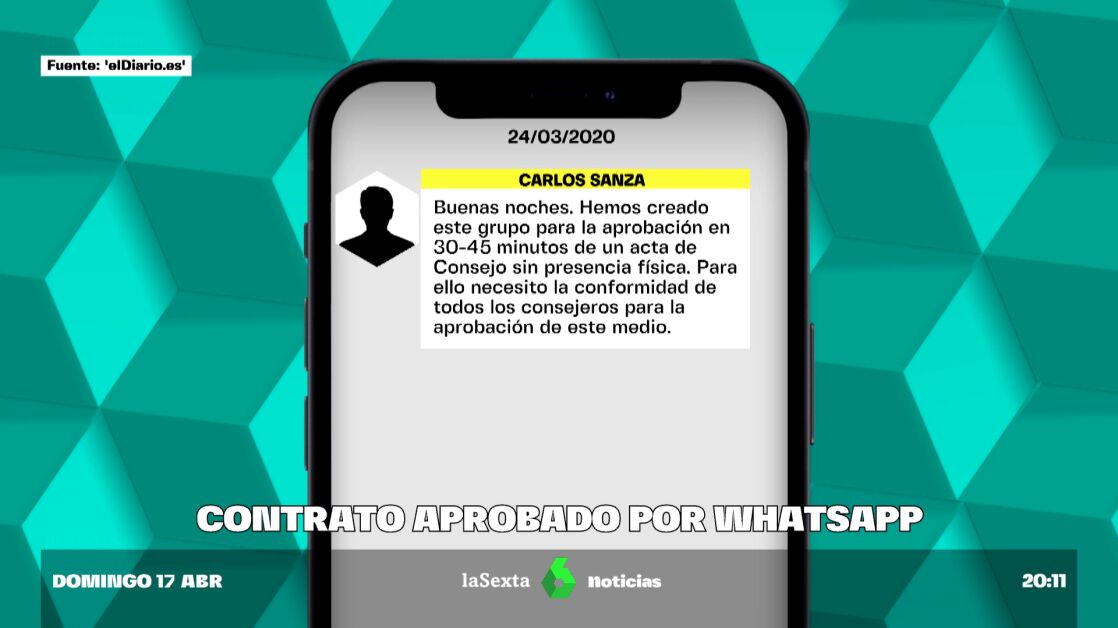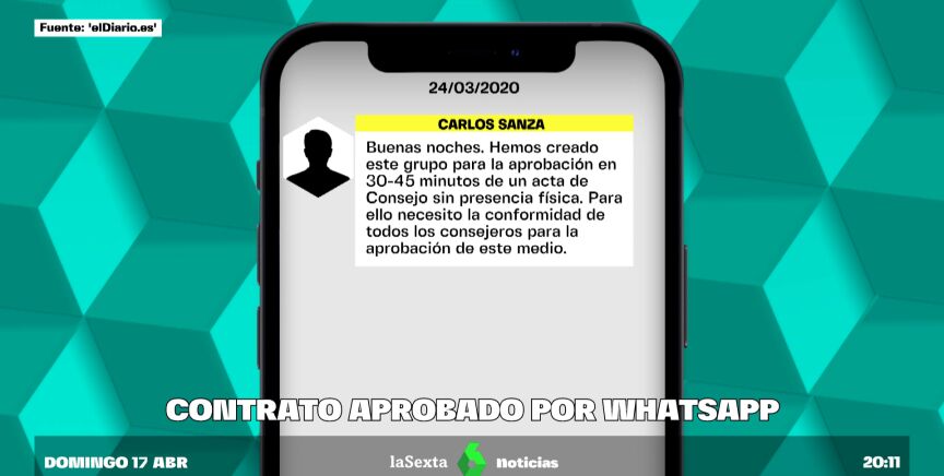 El polémico contrato de las mascarillas del Ayuntamiento de Madrid se aprobó en el peor momento de la pandemia, de madrugada y por WhatsApp. "Buenas noches. Hemos creado este grupo para la aprobación en 30-45 minutos de un acta de Consejo sin presencia física. Para ello, necesito la conformidad de todos los consejeros para la aprobación de este medio", publicó Carlos Sanza, secretario general de la Empresa Municipal de Servicios Funerarios y Cementerios de Madrid, tal y como ha desvelado 'eldiario.es'.
