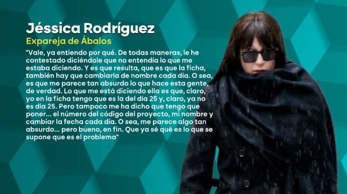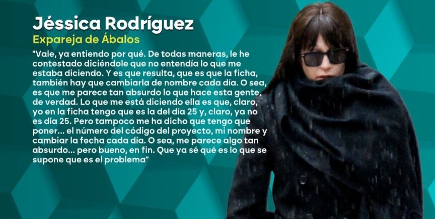 Jéssica Rodríguez, expareja del exministro José Luis Ábalos, mostró su indignación en unos audios por tener que fichar en los puestos de trabajo a los que debía acudir según los contratos que tenía en TRAGSATEC y en INECO. "Resulta que la ficha también hay que cambiarla de nombre cada día", relataba la expareja de Ábalos. "Me parece tan absurdo lo que hace esta gente...", añadía, mostrando su indignación por tener que someterse a un control de asistencia.