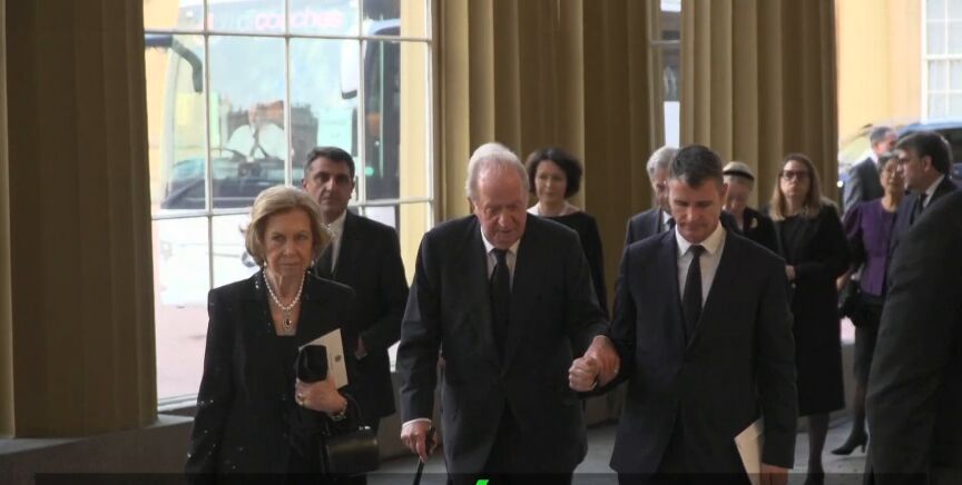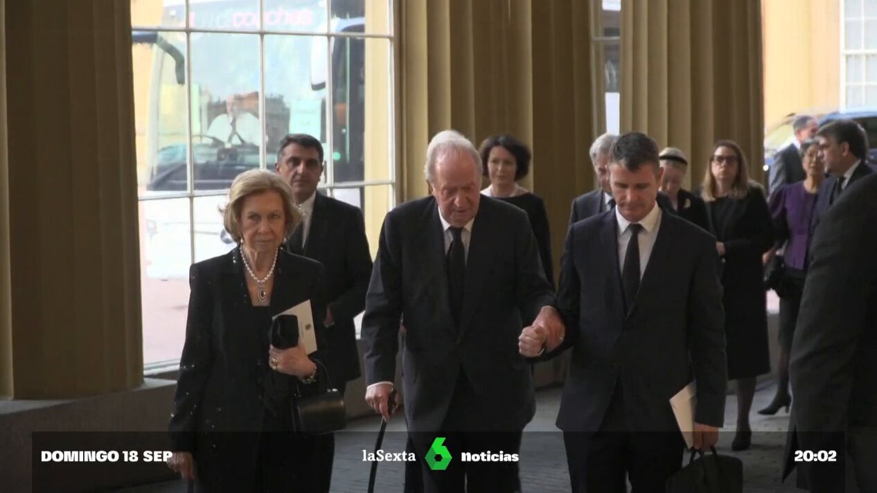 El rey emérito acude al entierro de Isabel II en Londres, que tendrá lugar este lunes. Previamente, el nuevo rey de Reino Unido Carlos III preside una recepción con los asistentes.