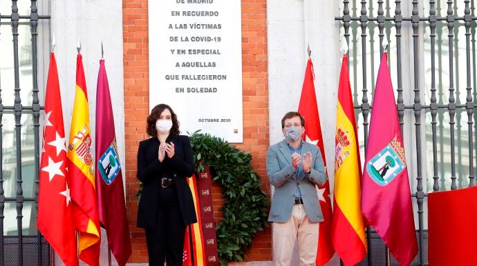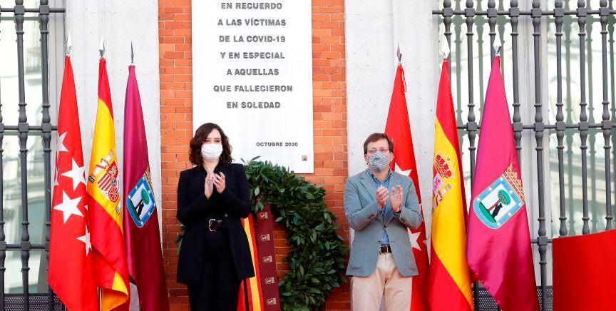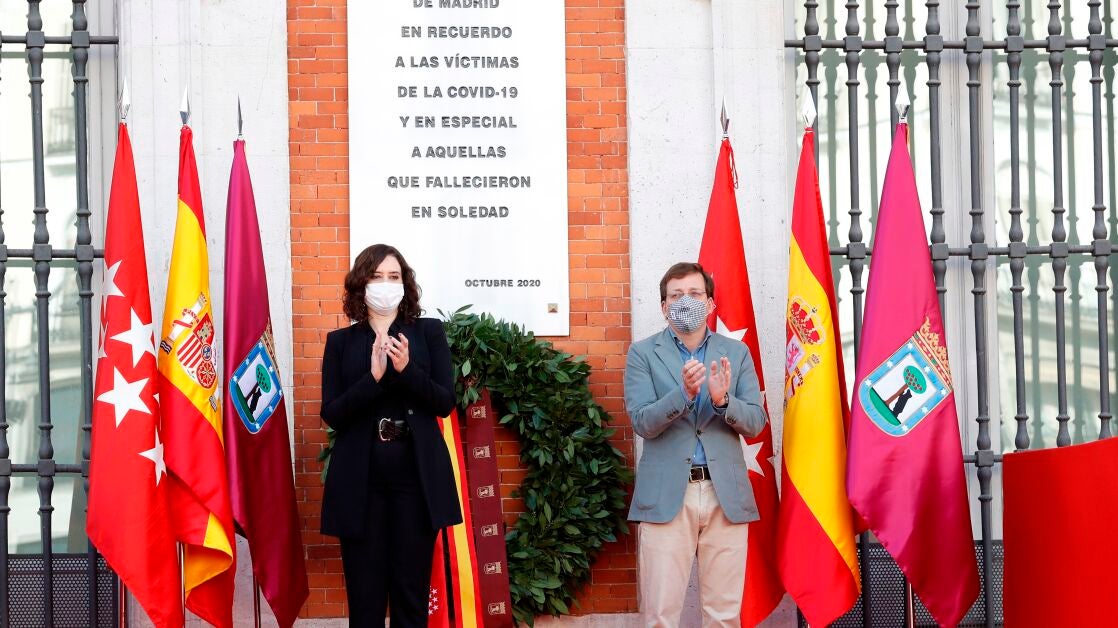 Ayuso ha presidido junto a Martínez-Almeida un acto en el que se ha descubierto una placa en recuerdo de las personas que han perdido la vida a causa de la pandemia. Tanto PSOE como Más Madrid denuncian no haber sido invitados.